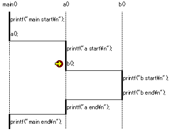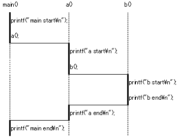 このプログラムの流れを書いてみると次図のようになります。下に行くほど時間が経過しており、main関数でa関数を、a関数でb関数を呼んでいる状態を図示しています。